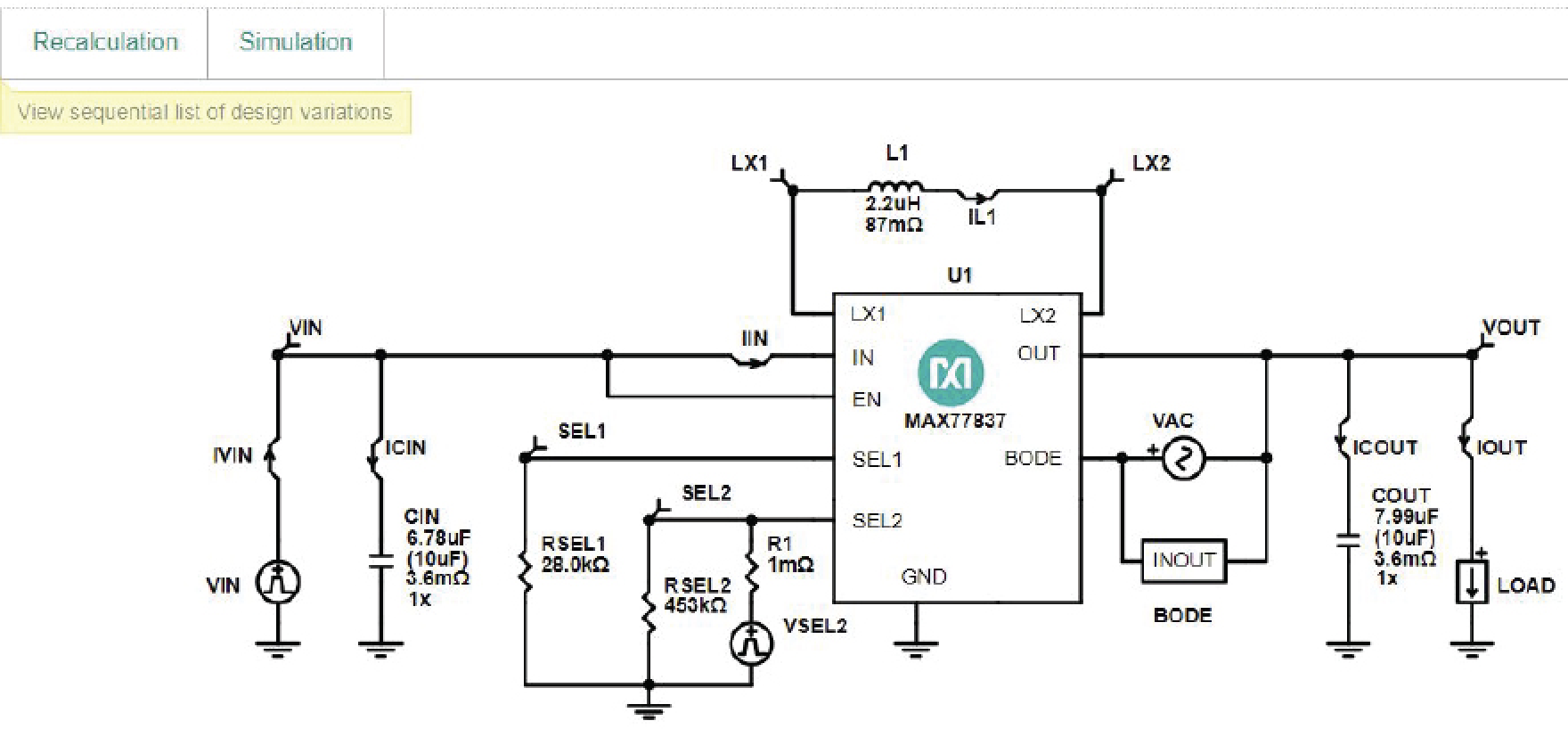 Sur la base du calcul du simulateur et des valeurs de composants externes réels, il est possible de simuler un circuit et de générer les formes d’onde de différents courants et tensions. Il est également possible de simuler des échelons de charge, des boucles en courant alternatif, des transitoires de ligne ou le niveau de rendement.