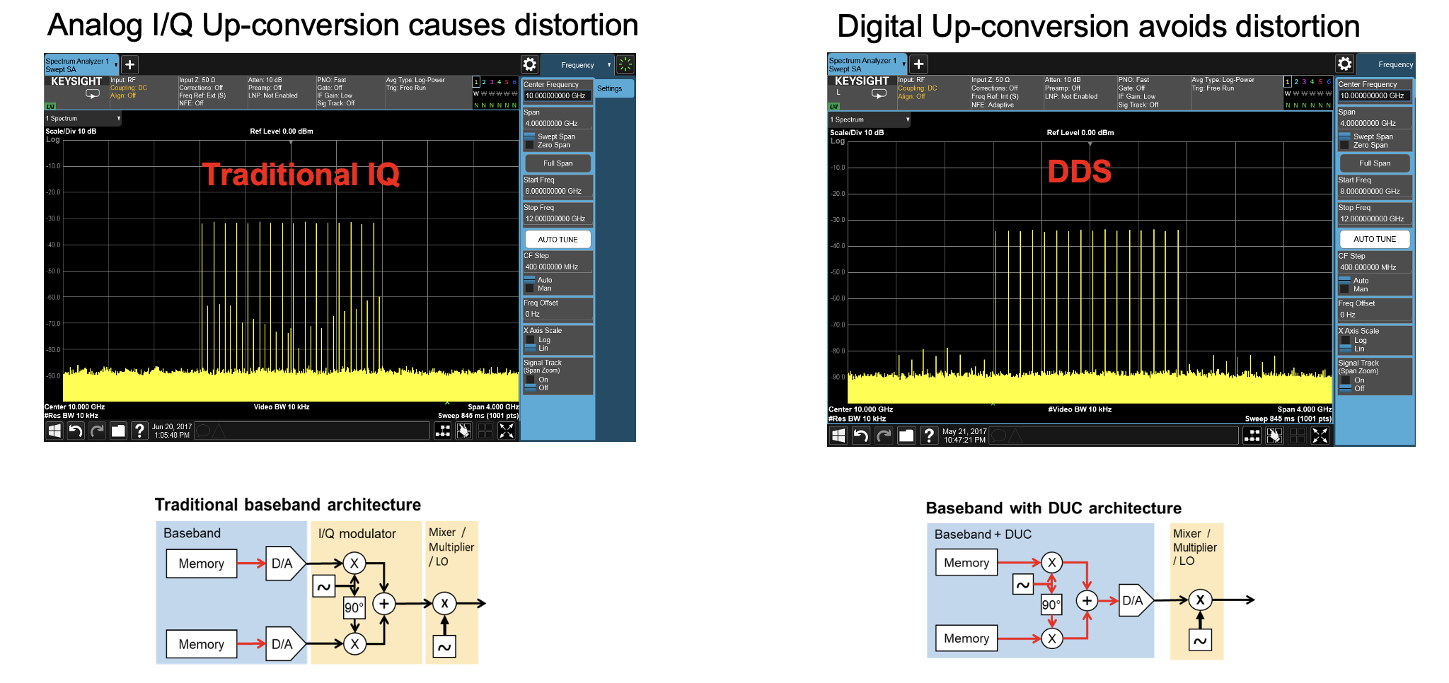 Le générateur offre en outre des performances RF avancées avec la technologie de synthèse numérique directe (DDS avec 8,5 GHz de bande passante et numérisation des signaux RF sur 14 bits). Cette technologie élimine les dégradations du signal causées par les modulateurs I/Q analogiques traditionnels (voir illustration ci-dessous) et procure une fidélité du signal élevée pour la génération de signaux à large bande, ainsi que pour la caractérisation précise des dispositifs sous test, avec à la clé une synchronisation et un déclenchement précis des applications de test multicanaux/multi-instruments.