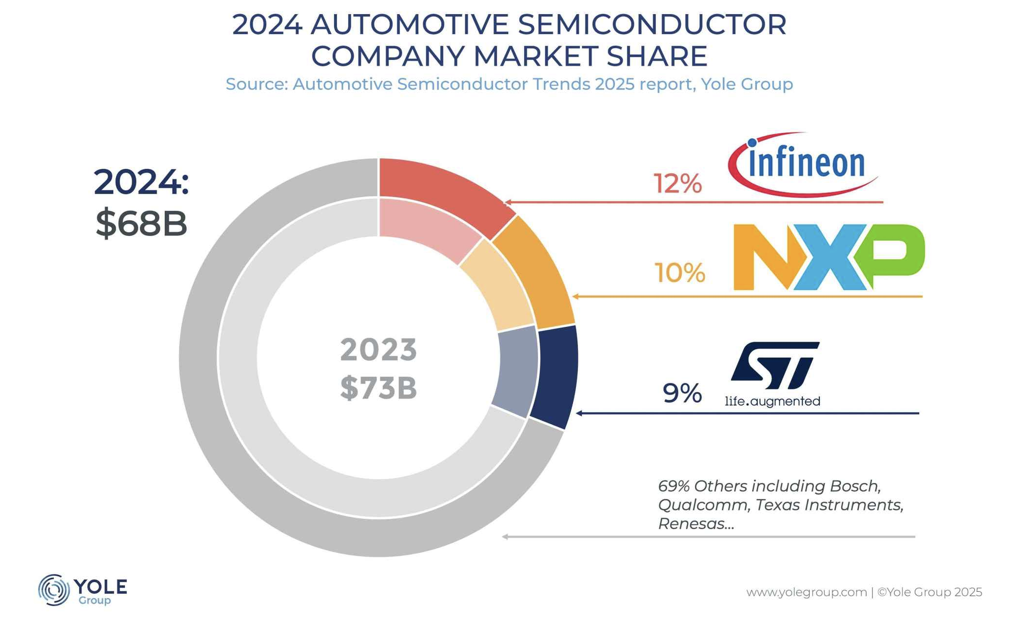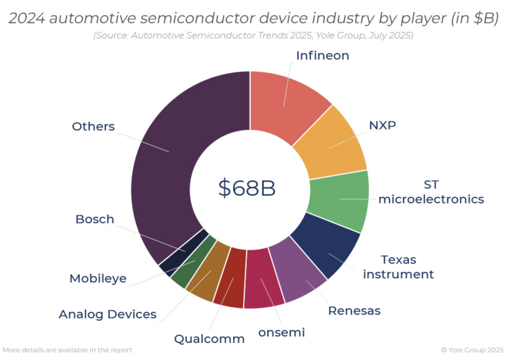 Au cœur de cette transformation, Yole indique que le paysage des fournisseurs est de plus en plus fragmenté et concurrentiel. Ainsi, selon Yole, les cinq premiers acteurs détiennent environ 50 % du marché des semi-conducteurs automobiles mais de nouveaux concurrents gagnent rapidement du terrain. Infineon Technologies est en tête des ventes avec un chiffre d'affaires de plus de 8 milliards de dollars dominant le domaine des modules de puissance Si/SiC, des pilotes et des microcontrôleurs. NXP suit de près, fort de sa présence dans les microcontrôleurs de réseaux embarqués, les radars et les émetteurs-récepteurs. Tandis que STMicroelectronics maintient son avance sur les composants discrets, l'électrification et les plateformes de microcontrôleurs, visant une croissance à long terme.