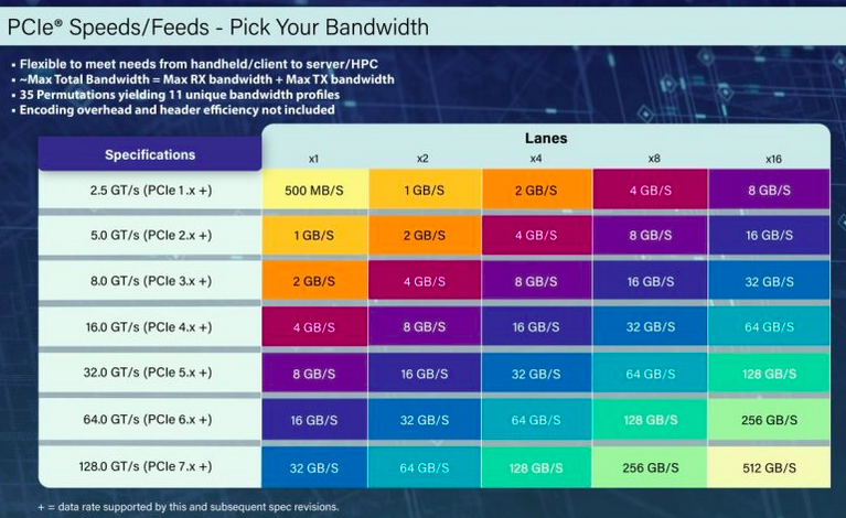 L’organisme PCI-SIG, en charge de l'évoution du bus série PCI Express, vient de publier la spécification PCIe 7.0 afin de répondre aux besoins en bande passante pour les applications fondées sur l’utilisation d’algorithmes d’intelligence artificielle (IA), et ce en vue d’ atteindre des débits de transfert jusqu’à 128 Giga Transferts/s.