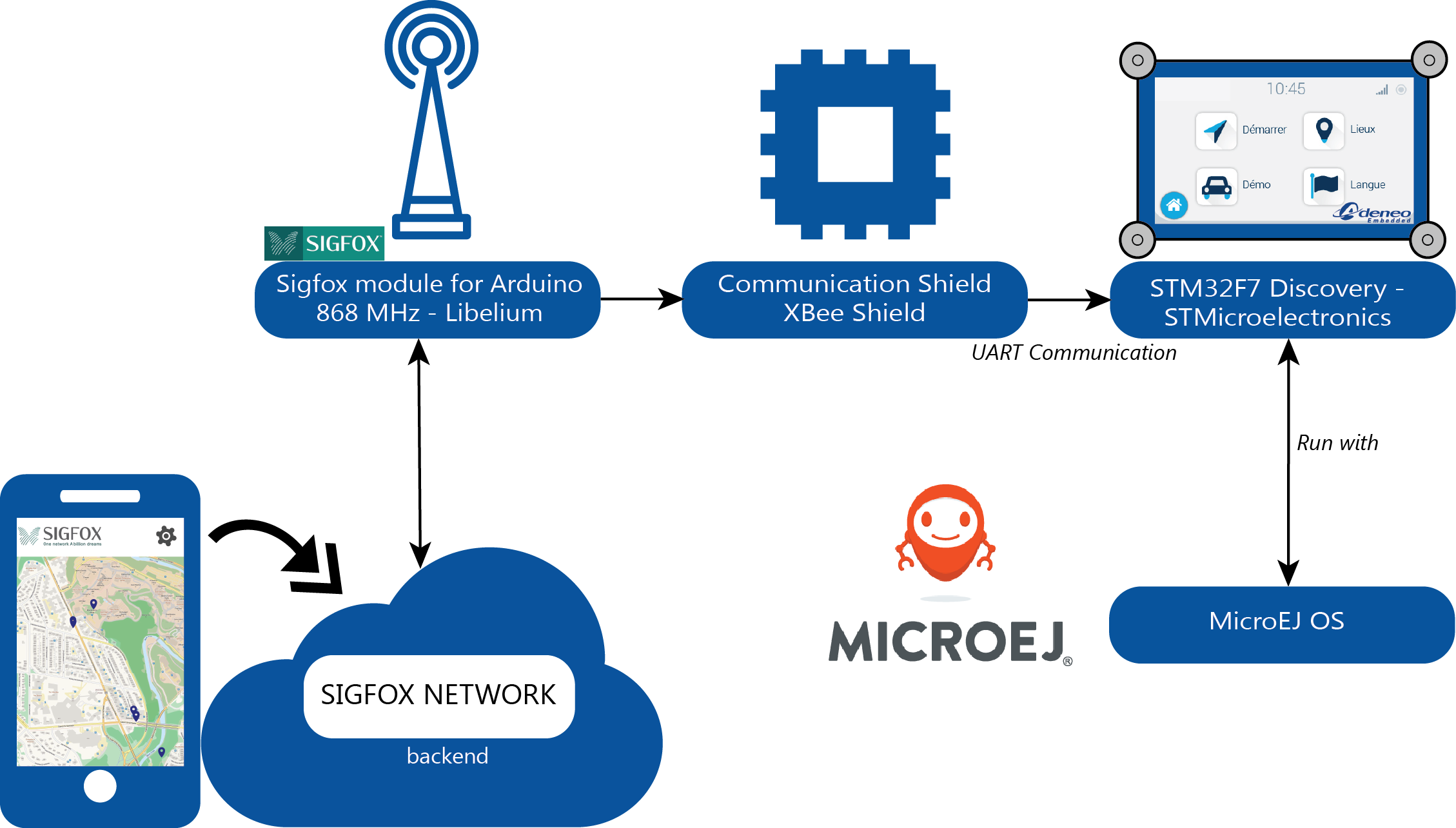 Le partenariat entre les deux sociétés permet de proposer aux utilisateurs une solution de connexion d’objets connectés au cloud via la couche logicielle embarquée de MicroEJ. La solution développée s’appuie sur une connexion au réseau Sigfox à travers un module radio SigBee fourni par le français ATIM. Les applications dédiées qui tournent sur le système d’exploitation MicroEJ OS intègrent un système de configuration et une interface graphique capable d'afficher la position géographique en temps réel des objets connectés grâce à un module GPS intégré sur le démonstrateur.