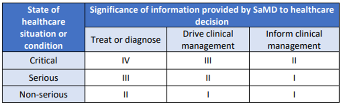 Un examen plus approfondi de la réglementation relative aux dispositifs médicaux est cependant prometteur. Le cadre de catégorisation des risques SaMD de IMDRF ('International Medical Device Regulators Forum) fournit une approche systématique de la classification des risques des logiciels destinés à des fins médicales. Il aide les autorités réglementaires, les fabricants et les autres parties prenantes à déterminer les exigences réglementaires appropriées et à s'assurer que les logiciels développés répondent aux normes de sécurité et d'efficacité nécessaires.