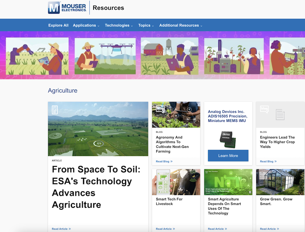 Afin de répondre à ce marché émergent, Mouser propose dans un site dédié une bibliothèque complète de ressources qui procure aux ingénieurs les outils nécessaires pour prendre des décisions éclairées, de l’irrigation à la fertilisation. Avec en ligne des e-books, des articles techniques, des blog et des produits adaptés issus de l’équipe technique de Mouser et de partenaires. L’objectif ici est d’acquérir des connaissances précises sur les technologies de pointe qui transforment l’agriculture. Parmi les solutions que met en avant Mouser sur ce mini-site on note :