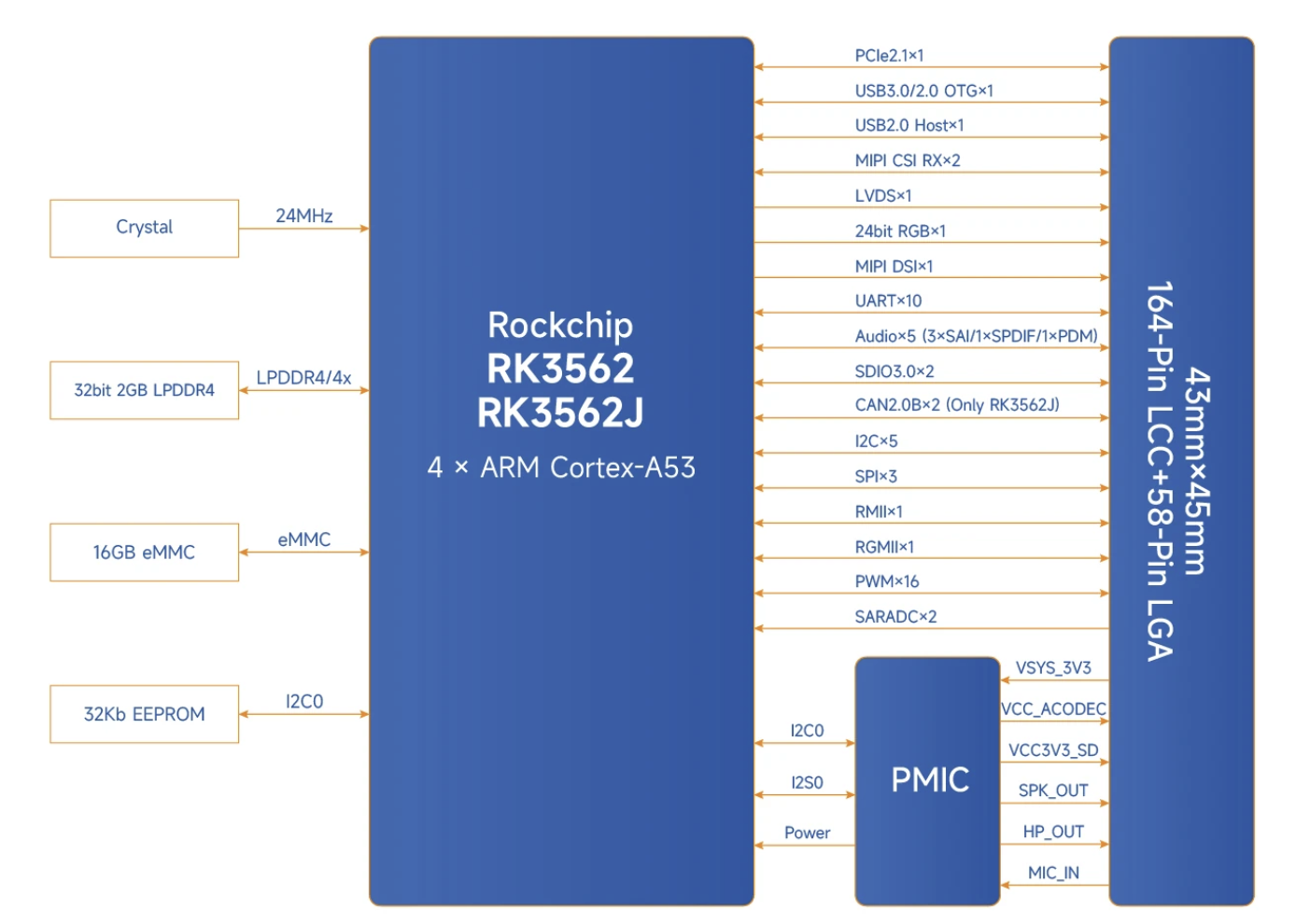 Le module processeur du chinois Myir Tech, référencé MYC-YR3562, est une carte SoM (System On Module) architecturée autour du processeur Rockchip RK3562, doté de quatre coeurs Arm Cortex-A53, flanqué de 16 Go de mémoire eMMC et 2 Go de mémoire RAM dans un encombrement minimal de 45 sur 43 mm. La carte est aussi conçue pour accepter le circuit RK3562J de Rockchip doté d’un accélérateur pour le traitement d'algorithmes d'intelligence artificielle jusqu’à 1 TOPS (téraopérations par seconde) avec 2 Go de mémoire LPDDR4, 16 Go de mémoire flash eMMC et une EEPROM de 32 Kbit/s.