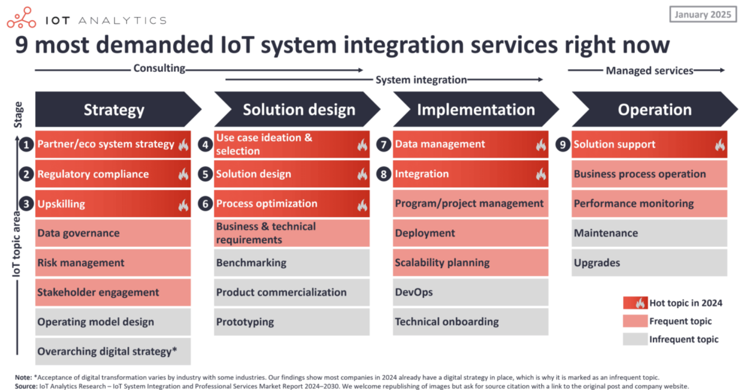 Dans ce cadre général neuf services d'intégration de systèmes IoT ont été détectés par IoT Analytics, les plus demandés à l’heure actuelle, sont au coeur des préoccupations des intégrateurs.