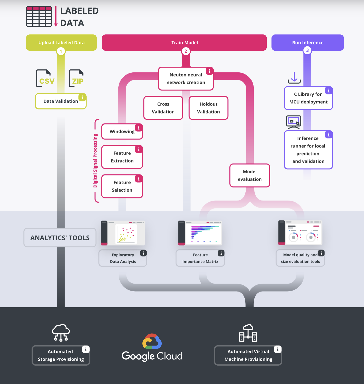 L’avancée technologique brevetée de Neuton.AI repose sur sa plateforme automatisée qui crée des modèles d’apprentissage machine (ML, Machine Learning) pesant moins de 5 ko, soit selon la société jusqu’à 10 fois moins que les approches classiques pour une rapidité améliorée d’un facteur 10. Bénéficiant d’une facilité d’utilisation élevée, grâce notamment à son approche de programmation "no code", ces modèles ne nécessitent aucun paramétrage manuel ni expertise en data sciences, autorisant la déploiement rapide sur des microcontrôleurs 8, 16 et 32 bits.