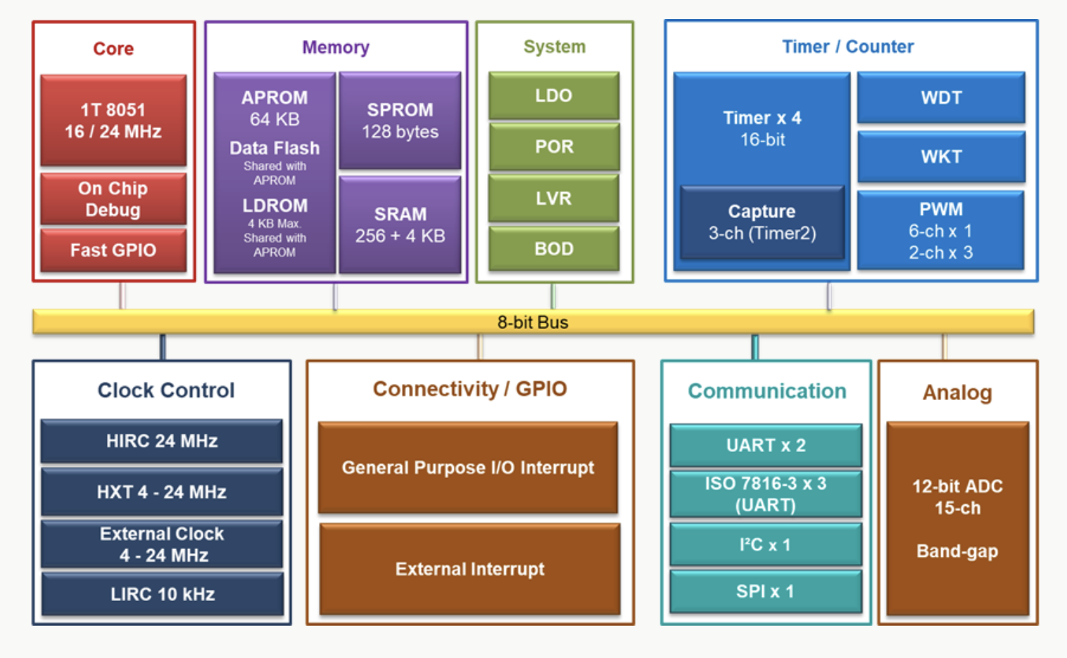 La série des MG51 de Nuvoton qui fonctionne sous 5 V dans une plage de températures industrielles (- 20 °C à +105 °C), propose une gamme de périphériques étendue : UART, I2C, SPI, convertisseur analogique/numérique 12 bits, ainsi que jusqu'à 46 entrées/sorties généralistes (GPIO).