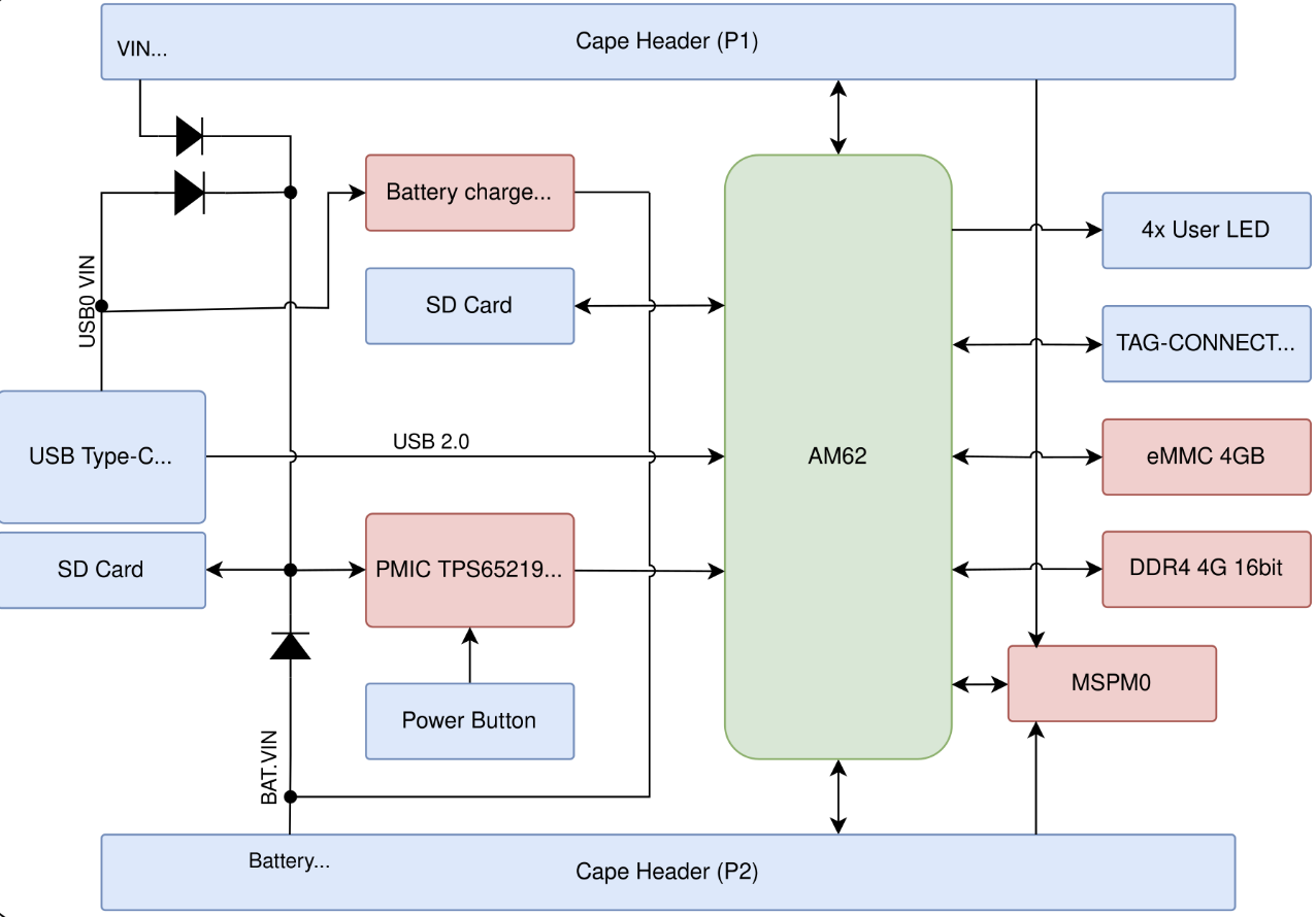 Toutes les autres fonctionnalités restent identiques par rapport à la première version de la PocletBeagle 2, à savoir une mémoire LPDDR4 de 512 Mo, un emplacement pour carte mémoire microSD, un port USB Type-C pour l'alimentation et la connectivité, un port pour sonde de débogage Raspberry Pi et deux connecteurs d'extension 36 broches.