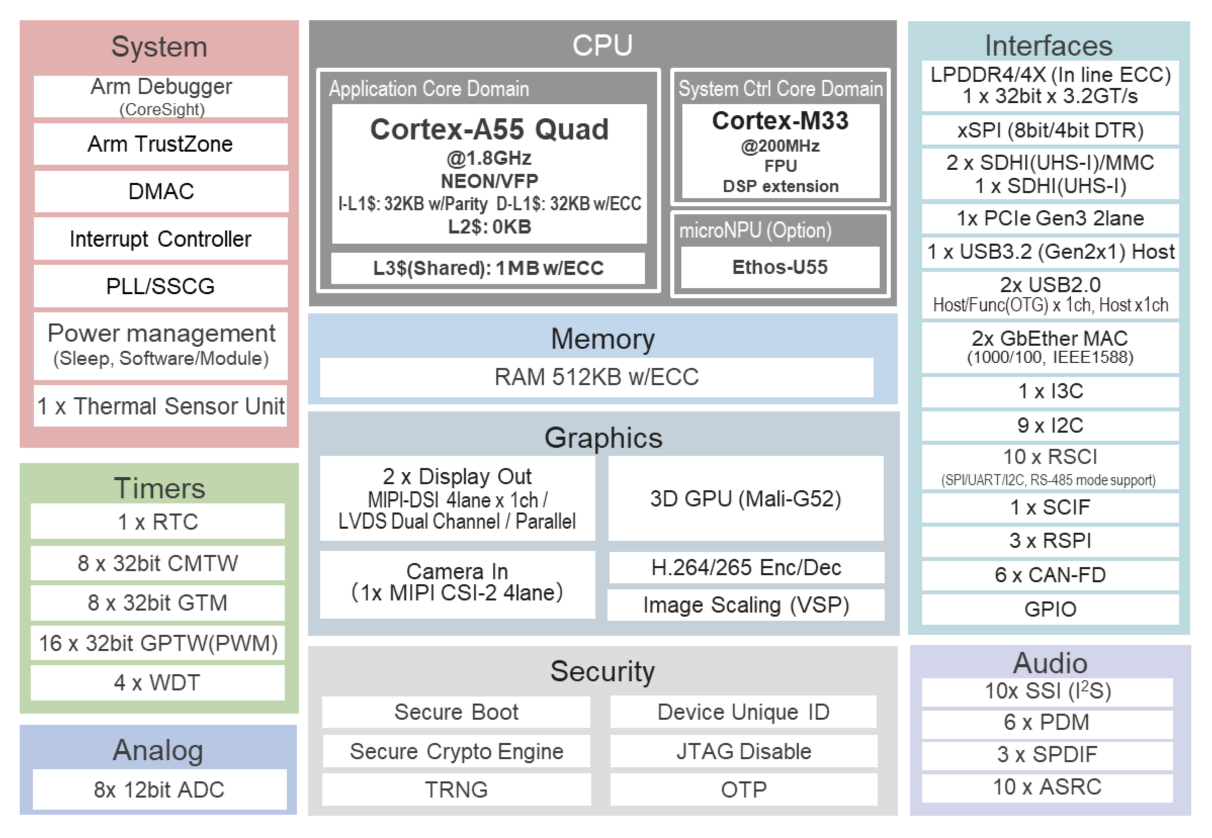 Au cœur du RZ/G3E, on trouve donc processeur quadricœur Arm Cortex-A55 flanqué d’un cœur Cortex-M33 et le processeur neuronal Ethos-U55 d’Arm pour réaliser les tâches liées à l’IA telles que la classification d'images, la reconnaissance d'objets, la reconnaissance vocale et la détection d'anomalies tout en minimisant la charge du processeur.