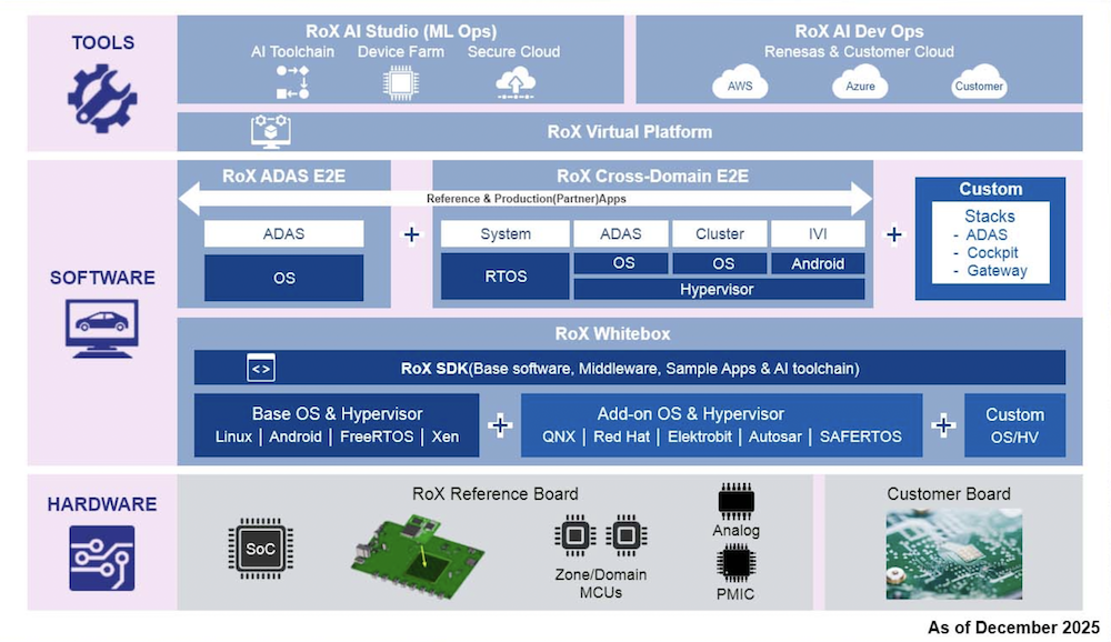 A mesure que le matériel et le logiciel deviennent plus étroitement intégrés tôt dans le développement afin de supporter des architectures électriques/électroniques complexes, Renesas indique avoir ajouter dans le même temps de nouvelles fonctionnalités à sa plateforme de développement RoX dont l’objet est de simplifier le processus de développement en combinant le matériel, le ou les systèmes d’exploitation mis en oeuvre, les logiciels embarqués et les outils.
