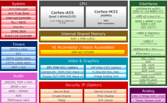 Côté caractéristiques, le processeur RZ/V2N est équipé de quatre cœurs Arm Cortex-A55 et d'un cœur Cortex-M33, couplés à un processeur de signal d'image, l’Arm Mali-C55.
